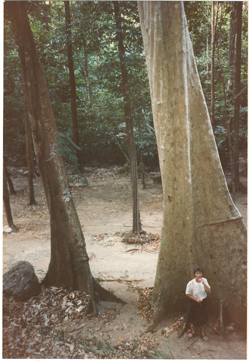 Mum under an enormous teak tree near Kancnahaburi 1988
